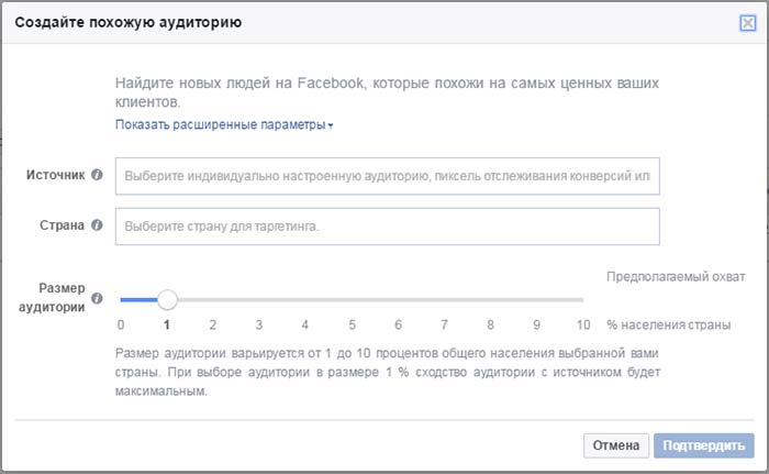 Похожие аудитории – еще один инструмент таргетинга в Facebook, которые создает аудиторию пользователей, на основании местоположения, возраста, пола и интересов уже существующих ваших аудиторий.