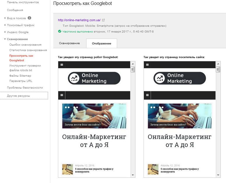 Для этого, необходимо зайти в Google Search Console > Сканирование > Просмотреть как Googlebot, где выбрать мобильного агента «Mobile: Smartphone» и нажать «Получить и отобразить» и инструмент покажет, как поисковый робот видит сайт.