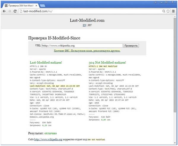 С помощью last modified 304 возможно исключить переиндексацию страниц, которые не изменялись с прошлой индексации, этот шаг особенно важен для сайтов с большим количеством страниц. Проверить ответ сервера на запросы роботов, можно в специальном сервисе http://last-modified.com/, который предоставляет возможность проверить любой сайт на корректность обработки заголовка If-Modified-Since.